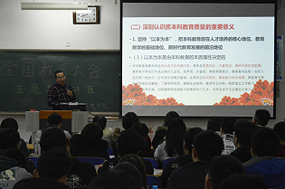 在讲座中,他传达了全国教育大会精神,简要讲解了全国教育大会提出的“九个坚持”,并在对比中外发展现状、尤其是梳理中国改革开放四十年取得的成就的基础上,阐述了“四个自信”对于我国教育发展事业的支撑。另外他重点阐述了抓本科教育的重大意义。他表示,身为新时代的青年人,一定要理解习近平总书记在全国教育大会上的讲话立意之高远、思想之深邃,这是习近平新时代中国特色社会主义思想在教育领域的全面阐述。因此全体员工一定要认真学习领会,结合自身经历在实践中予以践行。