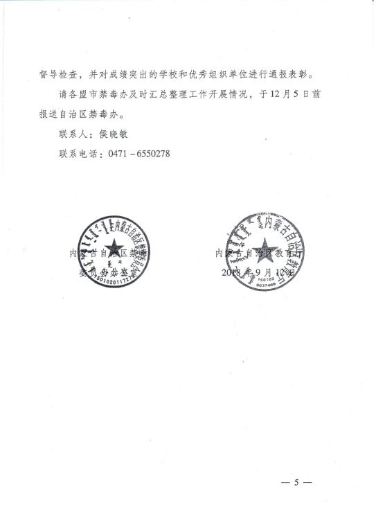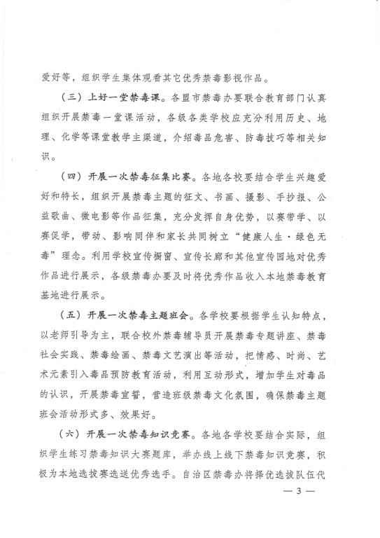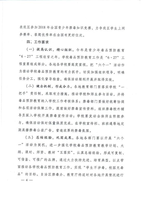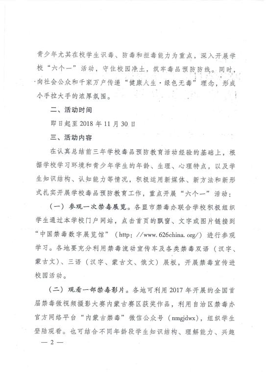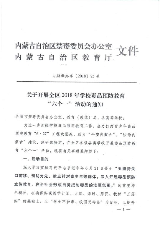根据内蒙古自治区禁毒委员会办公室、内蒙古自治区教育厅联合下发的《关于开展全区2018年公司毒品预防教育“六个一”活动的通知》要求(以下简称《通知》),在全校开展毒品预防教育“六个一”活动。现将有关事宜通知如下。