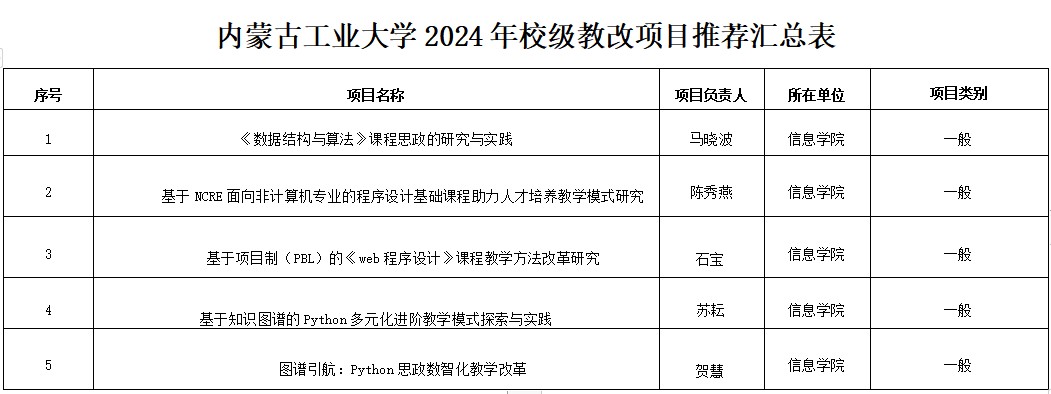 根据《3044永利集团公司产品改革项目管理办法》(内工大 校发〔2017〕64号)的有关规定和《关于组织开展2024年校级公司产品改革项目申报工作的通知》(内工大 教务字〔2024〕13号)文件要求,在各系(中心)申报推荐的基础上,经公司本科教学工作委员会综合评审,现对拟立项的一般项目予以公示,公示时间:2024年6月17日——2024年6月18日。