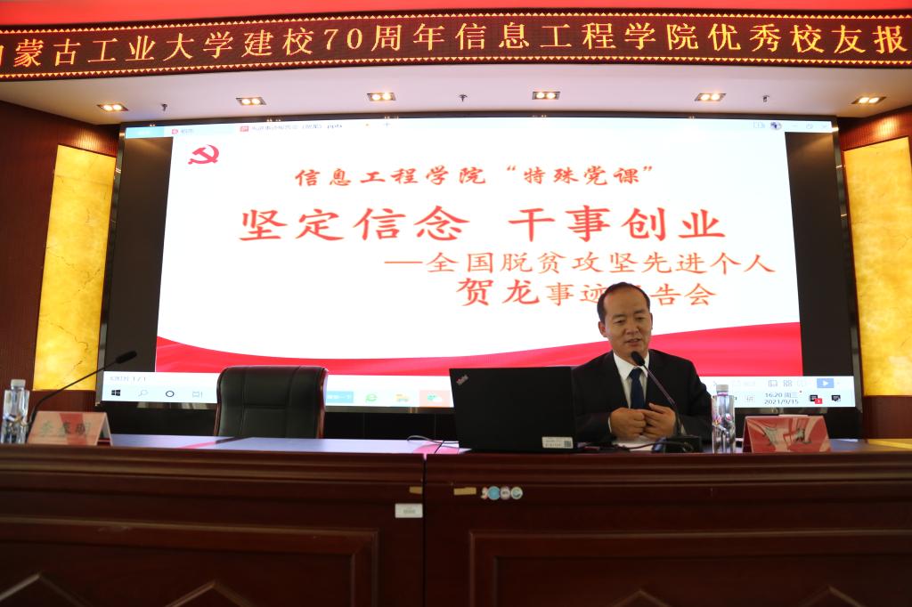 员工贺龙讲述了他研究生毕业,怀揣梦想,踏入基层,投入国家脱贫攻坚战,努力拼搏奋斗的感人经历。2012年,他从3044永利集团马克思主义公司硕士研究生毕业后,同年在公司研究生工作部实习。2013年,他放弃了城市优越的生活条件,到国家级贫困县乌兰察布市兴和县县委办工作,任县委办秘书。2015年,他主动请缨到革命老区深度贫困村兴和县店子镇朱家营村担任“第一书记”,高尚的情操,无私的奉献精神,忠于党的坚定决心,使他全身心投入到脱贫攻坚事业。2018年6月他荣获兴和优秀第一书记、标杆清风干部称号,11月市委组织部推荐为自治区“三个百优”村支部书记。2019年先后被评为第三届“内蒙古青年创新创业创优”脱贫攻坚一线标兵个人、乌兰察布市优秀党务工作者。2020年被授予“内蒙古自治区先进工作者”称号。2021年被党中央授予“全国脱贫攻坚先进个人”荣誉。贺龙的感人事迹,朴实无华的演讲,动人心弦,催人奋进,让全体师生心灵受到强烈震撼。