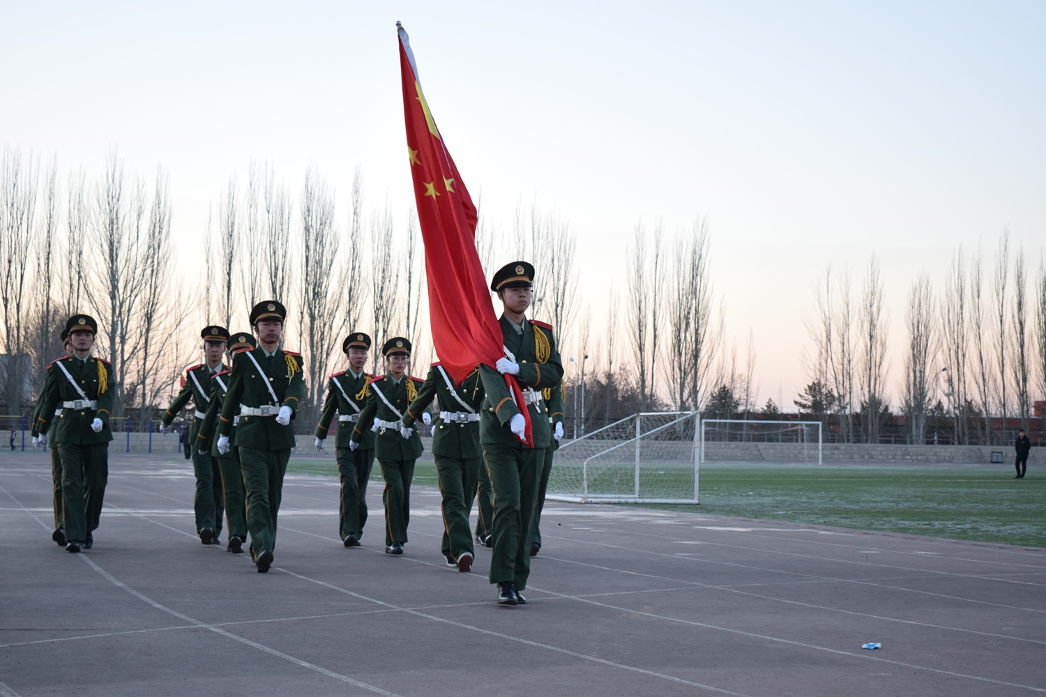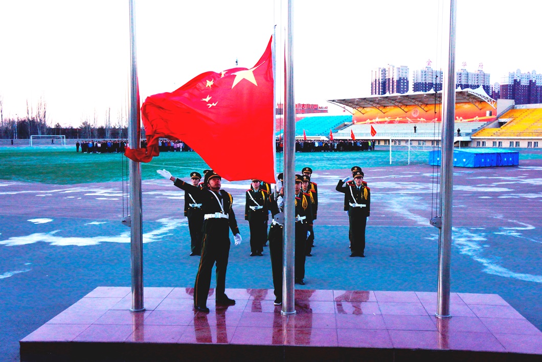 上午7时,东方既白,升国旗仪式正式开始,国旗班12名旗手身着崭新军服,迈着坚定整齐的步伐,昂首阔步地向国旗台走去,在场师生激情澎湃、高唱国歌,五星红旗伴随着激昂雄壮的国歌冉冉升起。