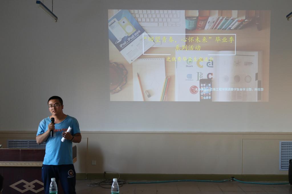 “同窗共话科技路 流年似水展未来”毕业生科技创新、就业创业经验分享会,活动现场邀请到了致力于科技创新、考研、保研、考上公务员的四位毕业生代表,通过几段视频回顾了学长学姐们的大学四年时光,重温了青春的故事,他们分别从科技创新、毕业升学、公务员考试、就业等方面介绍了自己的大学奋斗经历,分享了成功的经验,同时为在校学弟学妹未来的学习、职业生涯规划提出了意见和建议。