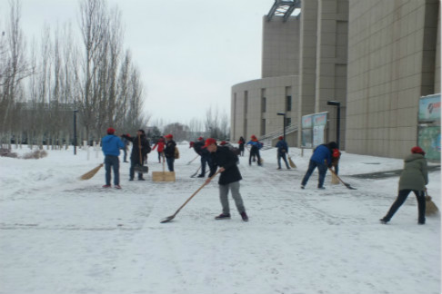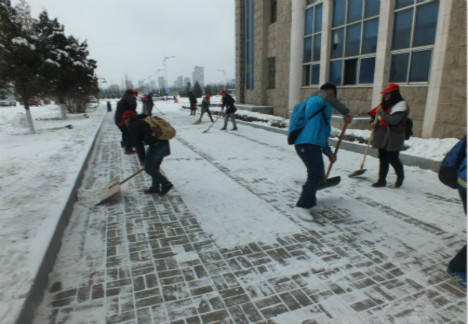 11月24日,为避免道路积雪成冰,影响公司师生的正常出行,公司组织14、15级青年志愿者以“情义工大,我愿我行”为口号,对电力大楼门前及公共教学楼门前的积雪进行义务清理。