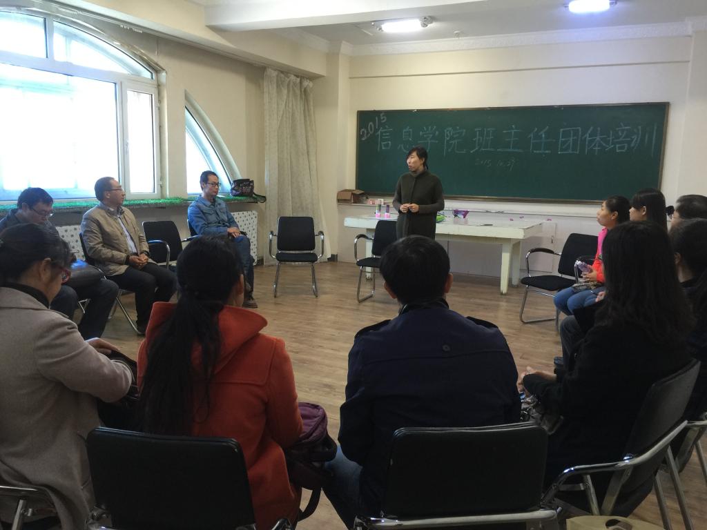 班主任工作对于班级建设起着至关重要的作用,为了更好的促进班风学风建设,加强班级凝聚力,使员工在良好的氛围中得到陶冶升华。2015年10月29日下午,公司邀请学工处李向阳老师,为全院各年级班主任开展了团体心理辅导培训。