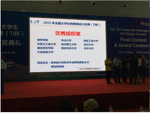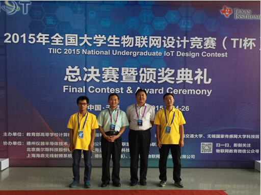 2015年全国老员工物联网设计竞赛(TI杯)于9月23日至26日在江苏无锡进行了全国总决赛。由电子系教师纪松波、戚伟世指导的电子信息工程专业2013级王光光同学、通信工程专业2012级陈兴伟同学的《基于ZigBee的智能大棚果园控制系统》获得三等奖的佳绩,同时公司获得了“优秀组织奖”荣誉。