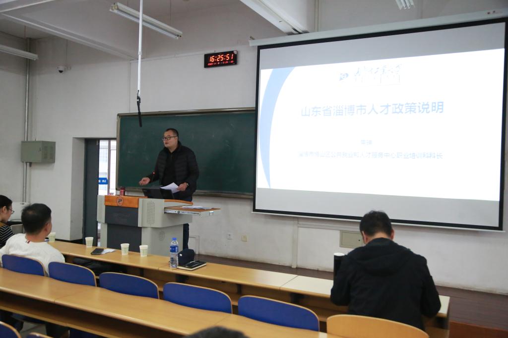 山东省淄博市就业和人才服务中心职业培训科焦坤科长分别从淄博市所处的地理位置、气候、民风、历史文化、名人及人才引进政策等方面进行了介绍。