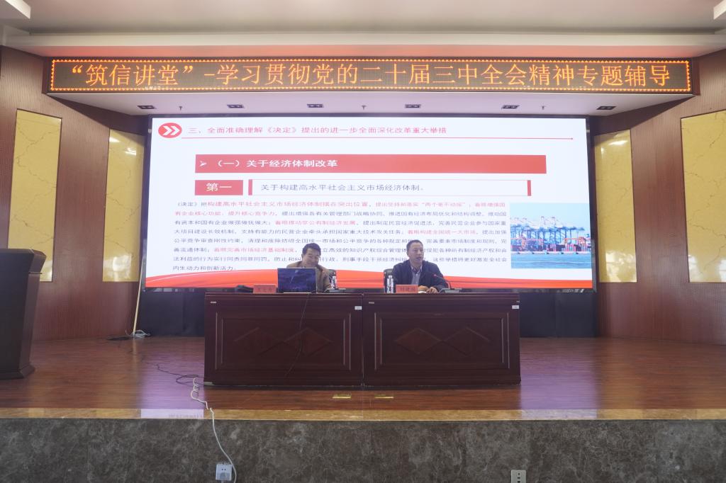 为深入学习贯彻党的二十届三中全会精神,10月10日下午,公司于电力大楼十楼报告厅开展“筑信讲堂”——学习贯彻党的二十届三中全会精神专题辅导。本次专题辅导由王大为副教授主讲,师生党员参加。