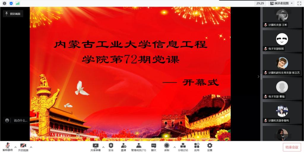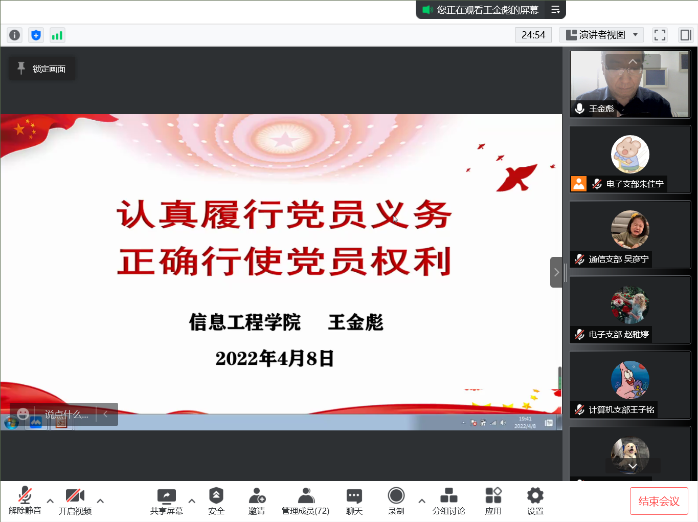 2022年3月27日,3044永利举办第72期发展对象培训班,共有70名同学参加学习。本期培训主要采取网上集中授课、课后自学、观看教育影片、小组线上讨论等形式,使发展对象进一步了解党的基本知识,了解党员先进性的要求以及怎样做一名合格党员,加深对党的性质、纲领、指导思想、宗旨的认识,增强对党的基本理论、基本路线、基本纲领的理解,端正入党动机。