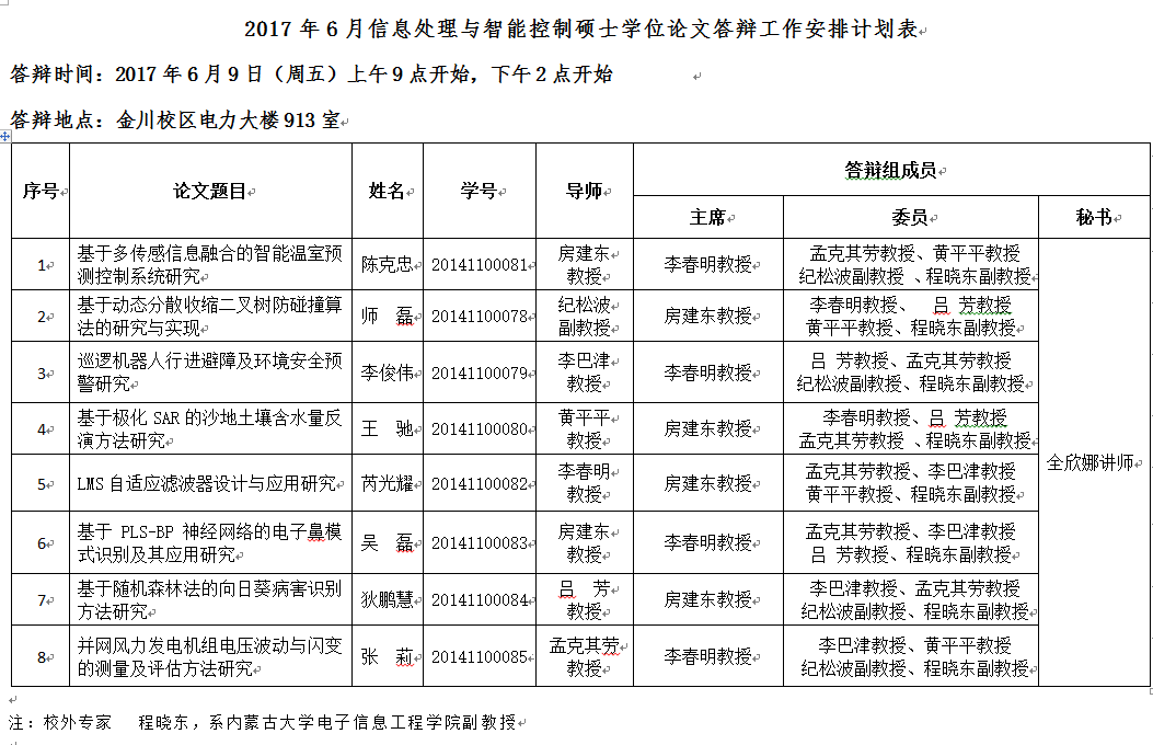 2017年6月信息处理与智能控制硕士学位论文答辩安排