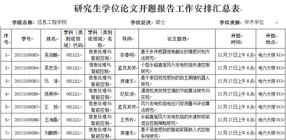 2016年12月信息处理与智能控制硕士研究生开题安排