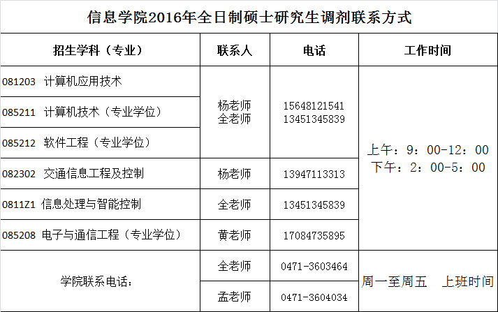 相关调剂政策可到3044永利集团研究生处网站(http://202.207.16.201/yjsweb/newwen.aspx?eid=465)查看,如有疑问,还可向公司各招生专业负责人咨询,各专业调剂联系方式如下:
