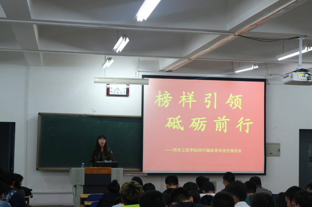 会上,通信工程13-2班郭慧,软件工程13-2班翟娜,网络工程13班包世光及通信工程13-1班李信四位同学就考研备战、保研选择、公务员应考及就业、择业经验等四个方面为学弟学妹们讲述了自己的经历,分享了自己的经验,并鼓励他们大四这一年一定要端正态度,调整好心态,信心满满的去迎接挑战,碰到困难一定要多争取、多询问、多借鉴、多付出,大胆尝试,挑战自我,赢得一个美好的明天。